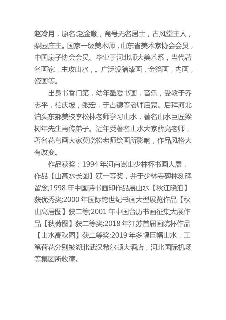 赵冷月,原名:赵金顺,斋号无名居士,古风堂主人,梨园庄主。国家一级美术师,山东省美术家协会会员,中国扇子协会会员。毕业于河北师大美术系,当代著名画家,主攻山水,。广泛设猎漆画,金箔画,内画,瓷画等。